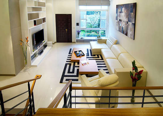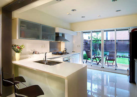 编辑推荐:设计师强调里外关系的呼应与融合,宽阔的后院以木板为架构,加上壁灯照明、绿意草皮、小树植栽,畅快写意,令人忘却凡尘琐事。