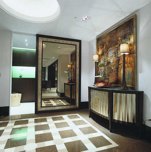 编辑点评:拼花处理的玄关地面,仔细端倪有着内圆外方的图腾交错,细节体现质感精神。