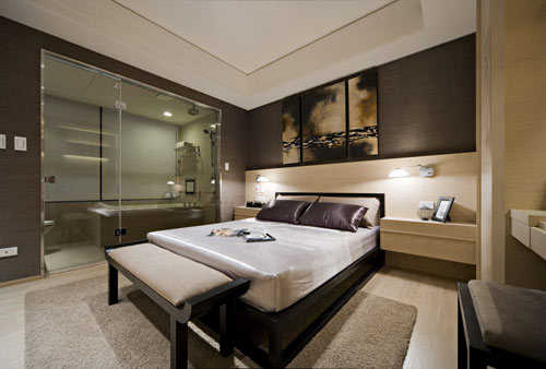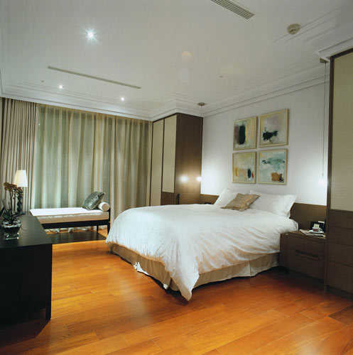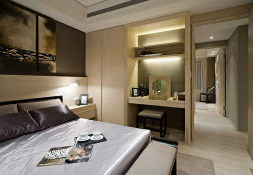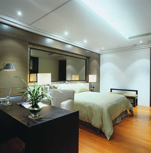 编辑点评:壁龛形式铺陈的床头主墙,银箔奢华点出主卧风格。
