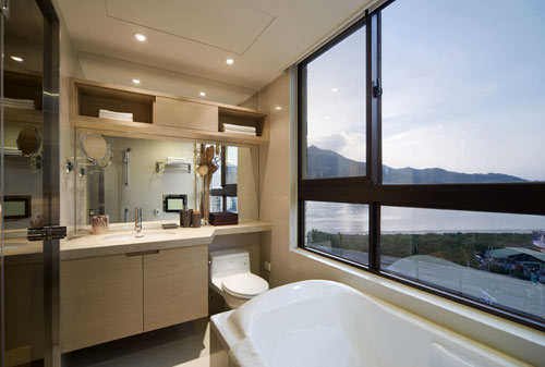 编辑点评:延续建商原有格局,休憩于床上仍可从卫浴透视窗外的山河风景。