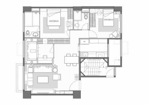编辑点评:公、私领域的切换,以餐厅的立体拉门为主题,侧向镜面除为厨房动线也有对称轴线关系思考。