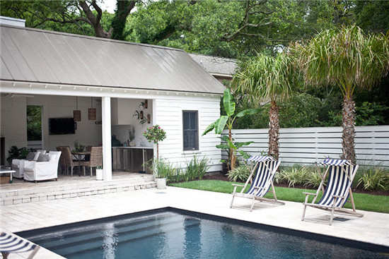 推荐理由:沙滩椅围绕泳池对称摆放,一来起到“围栏”的作用,让小孩子不易接近水池边,二来使得布局规整。