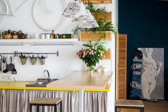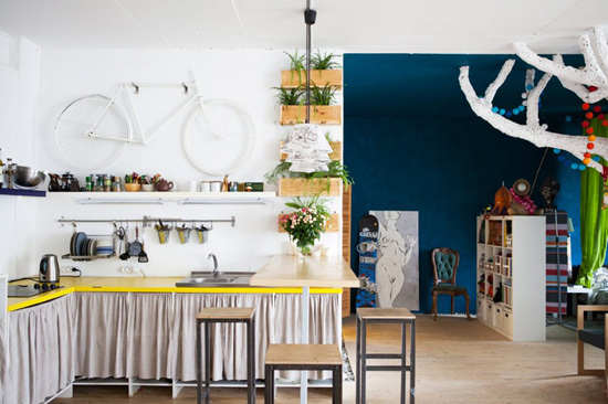 编辑点评:搁板用来摆放茶壶、茶杯等易碎品,铁挂杆用来挂放剪刀、勺子、锅铲等厨房用具,不但节省空间、方便取放,而且在通风环境下能保持厨具的干爽洁净。墙上立体的自行车艺术墙饰和植物盒子把厨房装点得特别有韵味。