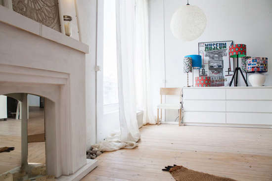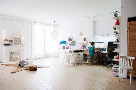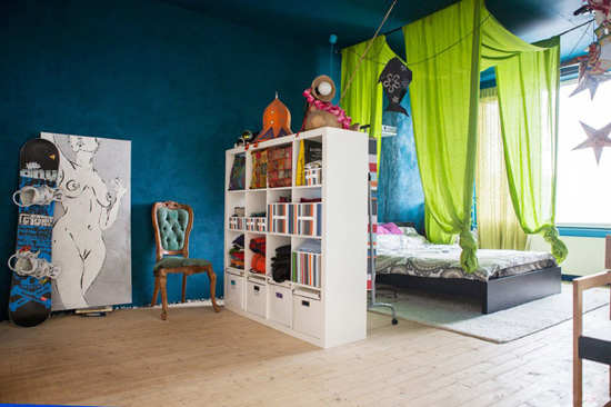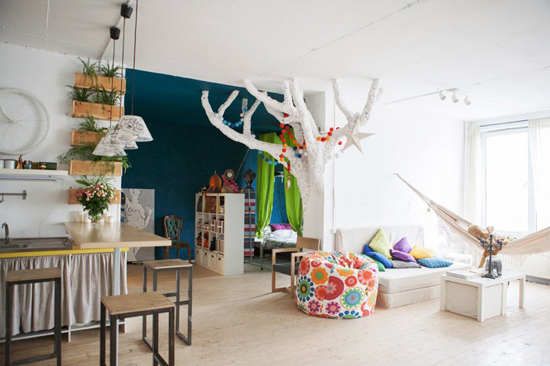 编辑点评:开放式的空间设计让小阁楼显得格外开阔,但各室迥异的风格和创意的隔断让分区变得容易。从客厅与卧室的隔断墙中延伸出来的树状设计非常大胆且有创意,极大地美化了空间和活跃了气氛,也让客厅更有立体感。