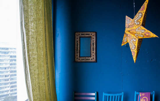 编辑点评:大面积的窗户保证了卧室的采光,蓝色的背景和星星吊饰是否会给你一种在欣赏几米的《星空》一样的美妙感觉呢?在这样浪漫的角落静静地看书或是发呆都是一种惬意的享受呀。
