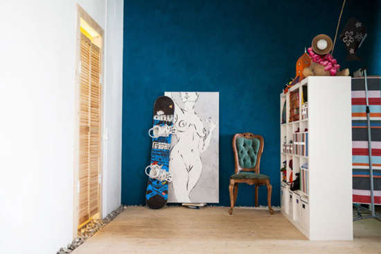 编辑点评:在卧室与卫浴之间的空余位置放上一张复古的椅子,再加上艺术画和滑板的点缀,便打造了一个小小的阅读区,在蓝色背景衬托下小空间显得特别有味道。