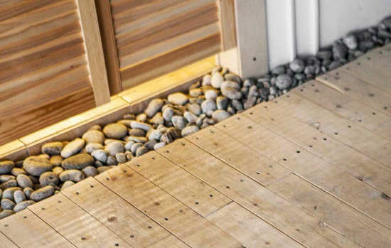 编辑点评:用鹅卵石填充的这条小过道作为卫浴与客厅、卧室的分界线,其实还发挥着一个不可或缺的作用——吸收水分。鹅卵石美化了凹槽同时形成了过渡区,防止卫浴里的水外渗到木地板上,从而防止了地板有发霉和腐烂的情况。