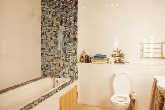 编辑点评:纯白色背景的卫浴空间干净整洁,用小方块墙砖装饰浴缸边缘和背景墙,使浴缸和整个卫浴空间都显得立体。浴缸侧边还开辟了小小的收纳空间,别出心裁。