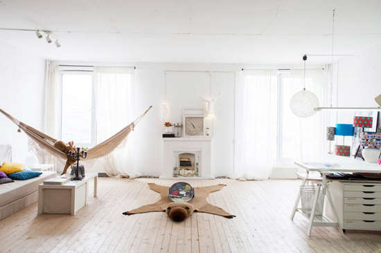 编辑点评:大面积的窗户保证了室内的采光,使宽敞的客厅空间更加开阔明亮,半透明的窗帘削弱阳光强度的同时保证了室内的亮度。木质桌子和木地板搭配起来大方质朴,自然地融入整体。棕色的吊床和熊形地毯为简约的客厅增添了趣味。