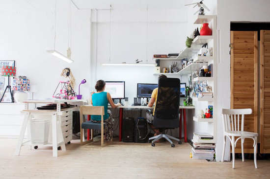 编辑点评:通过在墙上增添搁板形成储物架作物品收纳与展示,左侧的储物柜也发挥着收纳功能,白色的外观连同白色工作桌非常自然地融入整体,让小小的工作间看起来干净整洁,一应俱全。