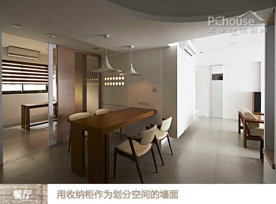 为了让客厅和餐厅隔而不断,设计师以悬吊式铁件做出双面柜体,餐柜与电视墙的结合把客厅和餐厅连结起来,但却完全不会阻隔视野。
