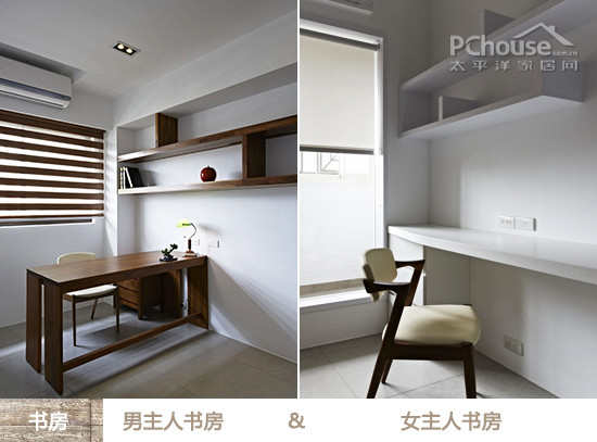 分别规划了男、女主人各自独立的书房,不同的色调迎合男女不同的喜好。