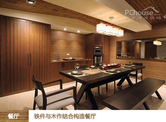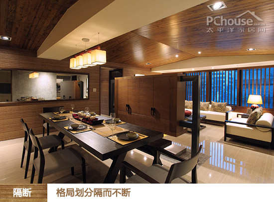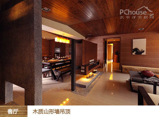 餐厅的背景墙是一大特色,另外纵向拉伸的木质吊顶对餐厅和客厅进行了明显的分区。