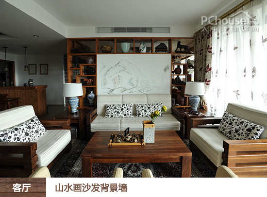 客厅用博古架以及中央的山水画形成沙发背景墙。博古架上摆放着各式古玩,兼具屏风和装饰的功能,成为沙发背景墙的一部分。