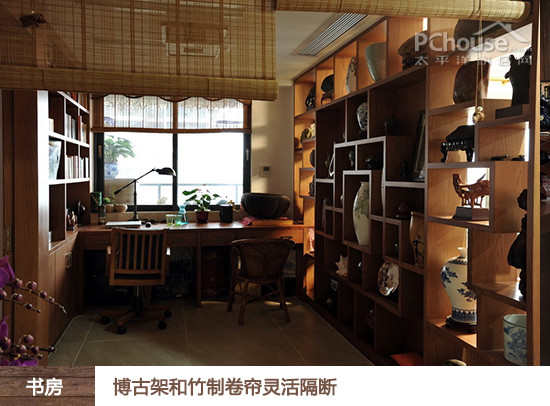 利用左侧的书架和右侧的博古架,从客厅隔断出的一个独立的书房。