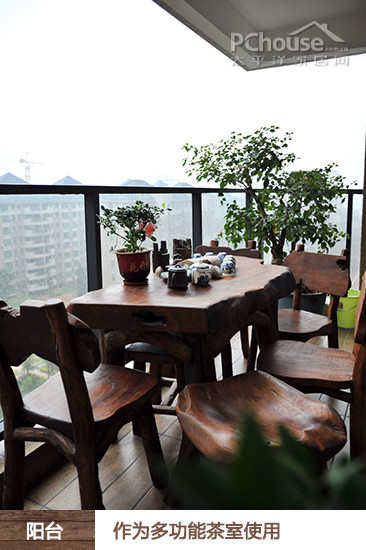 阳台的大空间不能浪费,可以用作一个开放式的茶室。船木桌椅返蹼归真,古朴的自然纹理,粗犷的风格,是一种中式的悠闲享受。
