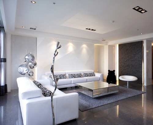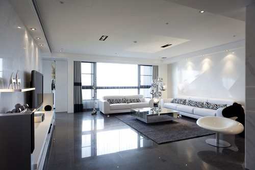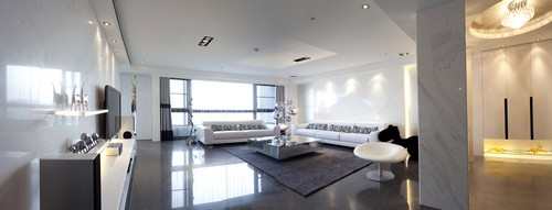 编辑点评:不规则钻石切割面沙发背墙在自然光线,及天花处三盏卤素灯投射下,闪耀出钻石般的夺目光彩,加上两侧对称设计的银箔墙面,白与银的搭配,在以银狐大理石带出的大器白中,妆点出时尚华美质感。