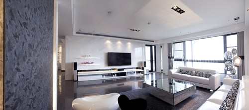 编辑点评:耀眼的日光穿堂入室而来,窜动的光体在银狐大理石电视墙,及由木作密集板与亮面烤漆为底设计的沙发背墙间彼此撞击。