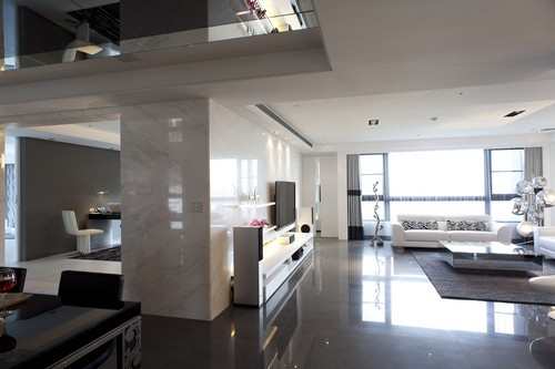 编辑点评:连续的白,从客厅窗边连绵到进入另一个场域前的尽头,银狐大理石电视墙,经过一个转折,直接导入后方的主卧室书房,完美串连场域气氛。