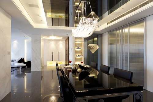 编辑点评:设计师利用擅长的镜面艺术,拉高场域挑空度,打造与白系空间对比的黑色时尚餐厅,并在以灰镜设计的红酒柜门片上切割出钻石的菱格纹线条,呼应客厅沙发背墙上的不规则钻石切割面。