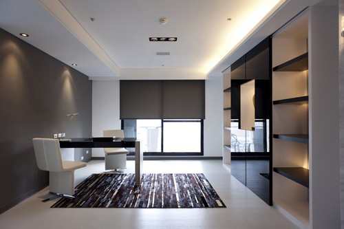 编辑点评:简洁的空间里仅有一张书桌、两张单椅、一张块毯及沿墙而立的造型书柜,设计师不让过份的缀饰抢走这份沈静,仅以灰色的墙面带出淡淡地极简表情,让静谧的氛围包拢,预作进入主卧室休憩前的准备。