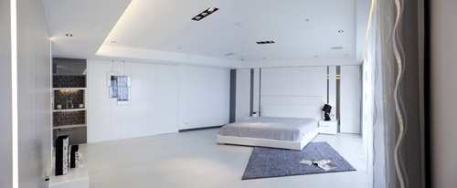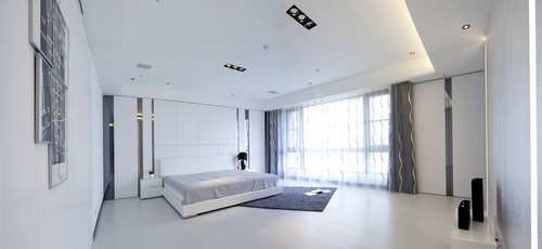 编辑点评:斜拉的端景墙上,细微几不可见的切割线条后藏有通往更衣室及主卫浴的门扉,走到底处,设计师藉由展示柜墙面上进口壁纸的几何线条,妆点一整个墙面的净白,小细节的点缀仿佛纯白天堂里的精巧饰点,完美铺排天使白的卧眠空间。