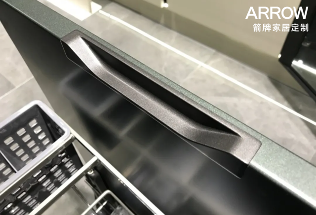 厨柜嵌入式拉手结合门型,一体式金属镶嵌,贴合厨房环境使用。