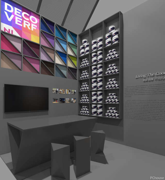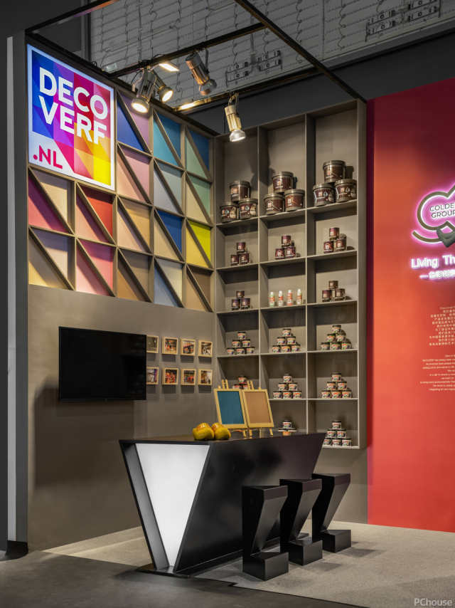 36 平方米的展馆分为上下两层,前台区域的色彩墙及油漆桶展示墙, 主打产品的主要展示场所,表达个性风格是这个空间的关键。前台正对的墙面采用“梵高画像”的马赛克,用不同的色块拼接出来,呼应整个产品的特性。