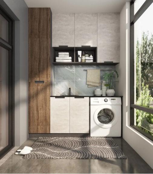 亚丁系列甄选印象水泥、浮雕清灰作为主色调,辅以摩登褐橡为搭配,自然纹路的柔软中和了工业元素的刚硬,打造出有温度的工业风;干净的色调、细腻的纹路、简练的线条,让现代艺术的基因在线面的排列中勾勒出明朗的律动层次,为家居空间铺染出沉静的自由感和时尚的艺术感。