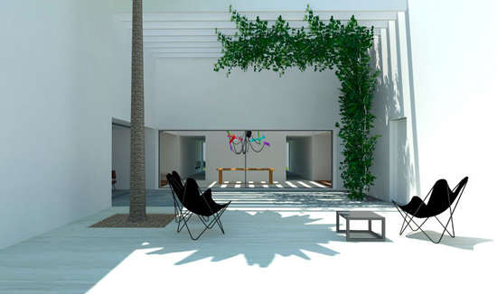 编辑点评:在宽敞的室外空间放上桌椅,利用高大的树木和墙壁遮阳,省地省钱又省心。倒L型的绿色植物为休闲区增添了活力与生机,也增强了空间的画面感。室内外空间以矩形门框作隐形分区,空间相连视野更开阔。