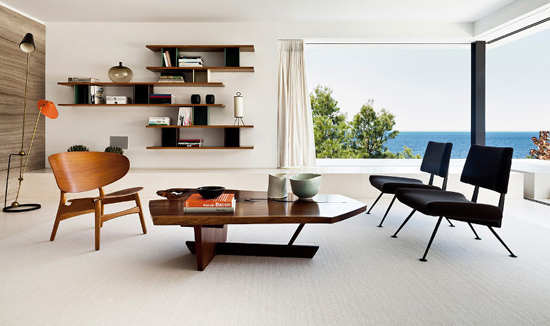 编辑点评:在墙上设置搁板形成收纳空间,既方便客厅物品收纳也美化了背景墙。L型玻璃墙设计让白色主调的客厅显得更加宽敞明亮,同时也便于在室内欣赏美丽的海景。