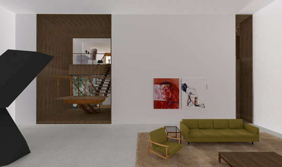 编辑点评:浅驼色的地毯划出了客厅区域,与橄榄绿色沙发和谐搭配。楼梯区域的墙体采用木质材料装修,与白色背景形成强烈对比,从而使楼梯形成立体空间。