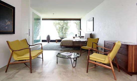 编辑点评:大面积的落地窗保证了卧室有足够的采光,也扩大了空间感。素雅的地毯划出了睡眠区域,另一侧成为了卧室的憩息区;大方质朴的木柜为卧室创造了收纳空间。