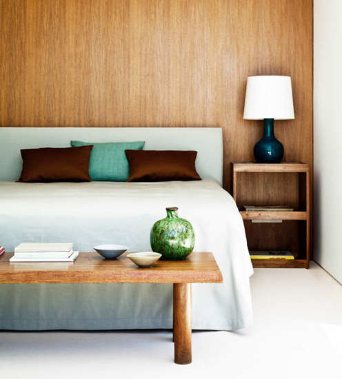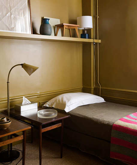 编辑点评:把床铺紧靠墙角放置,充分利用了角落空间,也为卧室腾出更多的活动区域。墙上的搁板为卧室增添了收纳空间,芥末黄色的墙壁、简约至极的床铺再加上质朴的床头柜,卧室整体充斥着60年代的荷里活电影风格,独具魅力。
