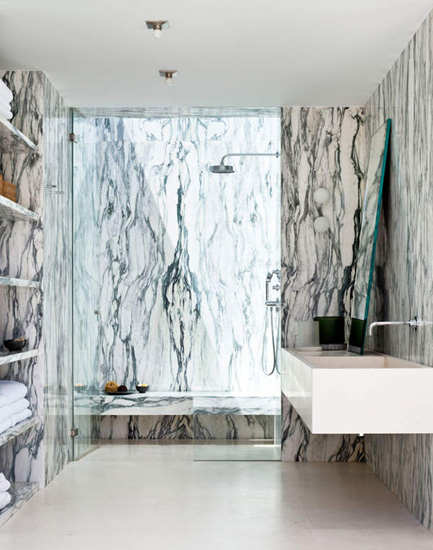 编辑点评:内嵌墙壁的储物架为卫浴用品提供了收纳空间,同时保持了卫浴外观的和谐统一;大胆时尚的墙面纹理让空间充满艺术气息。