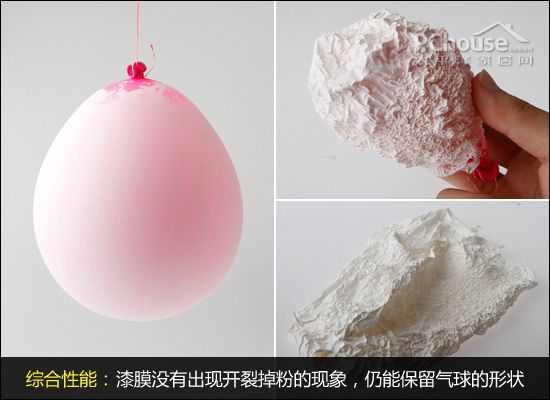 在充气气球表面均匀地刷一层涂料,待涂料干透后将气球缓慢地放气,此过程对漆膜的弹性、附着能力和抗裂性来说是个不小的考验。涂料流动性强,在气球表面形成的漆膜厚度较薄。即使如此,在气球放气的整个过程,漆膜没有出现开裂掉粉的现象,虽然有大量皱褶产生,但仍能保持气球的形状。这么薄的漆面能有如此表现可谓相当难得。