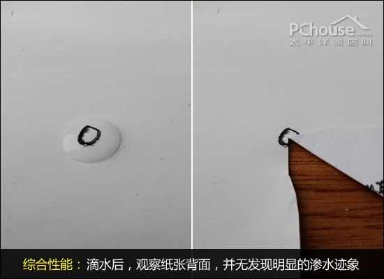 向涂料表面的圆圈处滴加水分,让水分与漆膜充分接触。5分钟过后,以圆圈的滴水位置为中点,剪开一部分。观察纸张背面,纸质有小许变软,但并无发现明显的渗水迹象,说明涂料能够在墙体与表面水分之间起到一定的阻隔作用,避免了水汽渗入墙体。