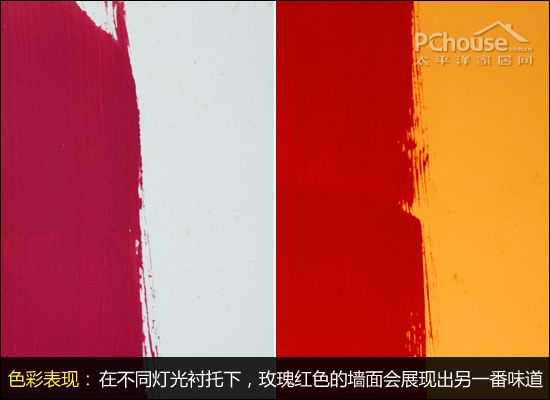 第三轮是将刷在墙面上的多乐士臻彩墙面漆分别用日光灯和昏暗灯光照射。在不同灯光的衬托下,玫瑰红色的墙面会展现出另一番味道。黄色灯光使玫瑰红色显得更深、更暖,也更温馨;而白色灯光则使玫瑰红色显得更光亮、更鲜艳。