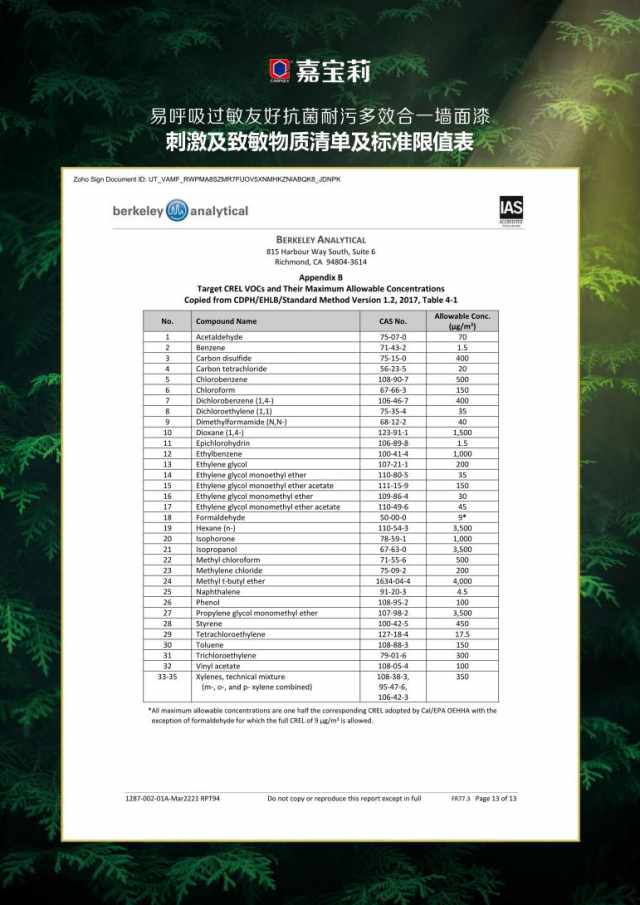 ASL哮喘&过敏友好认证对涂料产品中可能存在的刺激及致敏成分设置了极为严苛的标准限值,同时对产品涂刷后应用在不同场景的(教室、办公室)室内空气中挥发性有机化合物的组分、含量也有着严格的指标。易呼吸过敏友好抗菌耐污多效合一墙面漆是嘉宝莉在追求极致环保道路上的又一里程碑。同时,产品还获得了国际权威美国UL GREENGUARD室内空气质量金级认证、通过了法国室内空气环境检测A+标准。高品质环保产品,更适合易过敏、哮喘人群,呵护易敏人群的每一次呼吸。