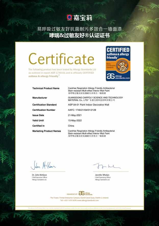 作为国内高端涂料领域的领军品牌,嘉宝莉始终专注于绿色环保涂料的研发与创新,追求卓越品质,打造出多款符合市场需求趋势的产品,研发实力位于行业技术潮流前列,推动着涂料行业技术和产品迭代升级。2020年8月,嘉宝莉提出“易呼吸”产品概念,并于2021年6月隆重上市易呼吸过敏友好抗菌耐污多效合一墙面漆。该款产品是目前中国涂料品牌首款通过国际认证机构过敏标准有限公司ASL发起的哮喘&过敏友好认证的高品质环保产品。