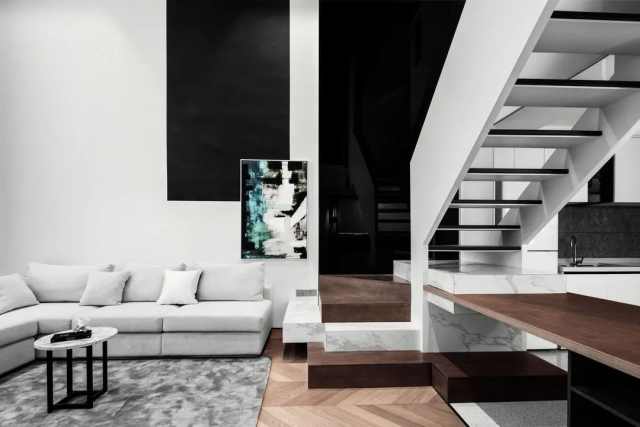 在整体深沉的灰、黑色空间中,使用局部的黄、绿、红色,打破格局。虽有大量的石皮装饰,但运用环形楼梯等增加灵动,让死板刻意的印象不复存在。玻璃的扶梯也是点睛之笔,丰富了上下串联的垂直空间。
