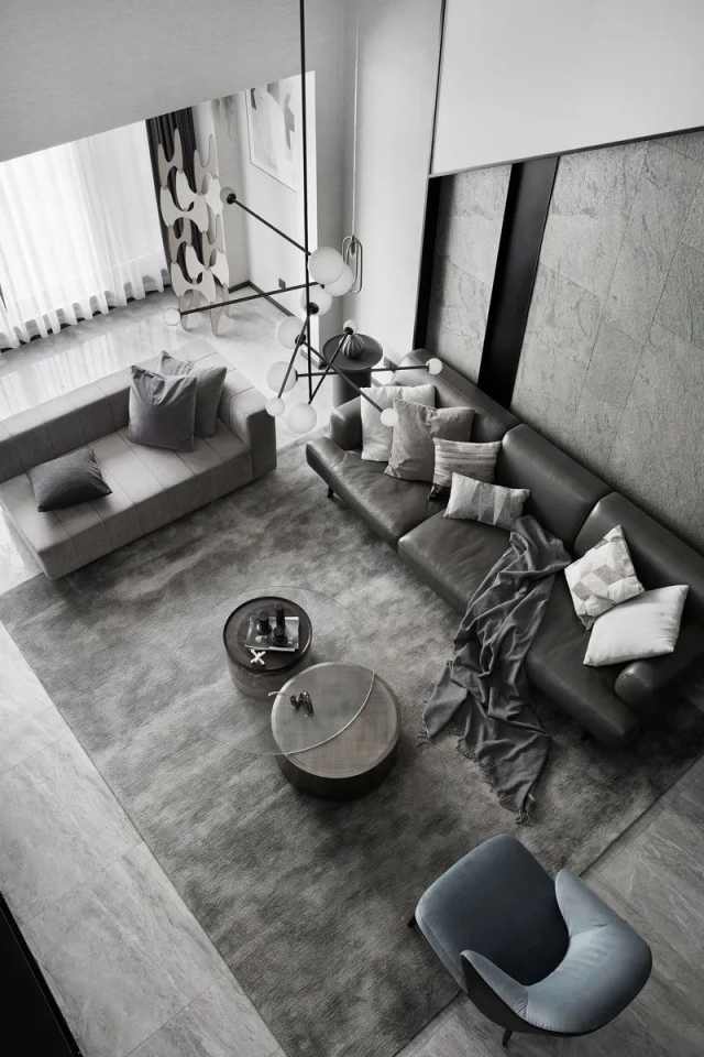 复式挑高的层高,轻而易举地就将窗外四季变换的景色引入宅中,屋外更迭的风景与屋内的艺术装饰交相辉映,或许就满足了我们对别墅最初始的想象。无论是客厅、卧室,抑或浴室、书房,大理石与皮制品贯穿了整个空间,烘托出主人的格调与品味。