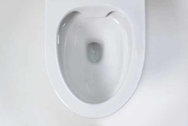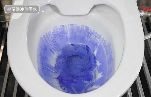 为了测试该技术的表现,我们分别在蹲便器和坐便器四周涂上蓝墨水后开始冲洗。