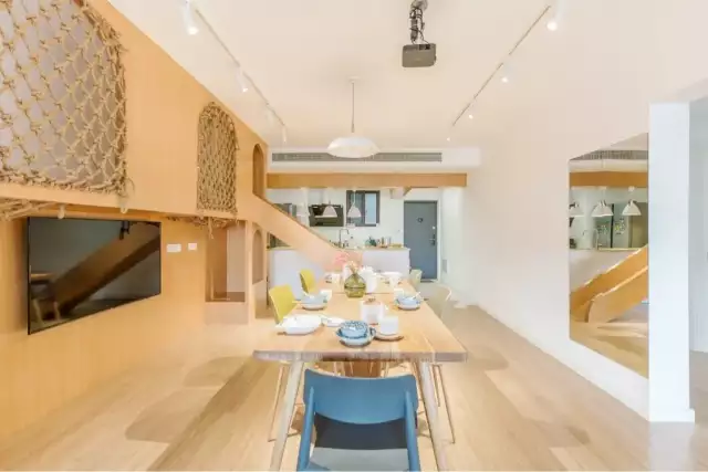 将公共空间打开重组,在不占用空间的情况下,竟然打造出了树屋、滑梯。利用阳台的区域,增加了游戏地台,通过高低差嵌入了海洋球池,这简直就是住在了游乐园里。