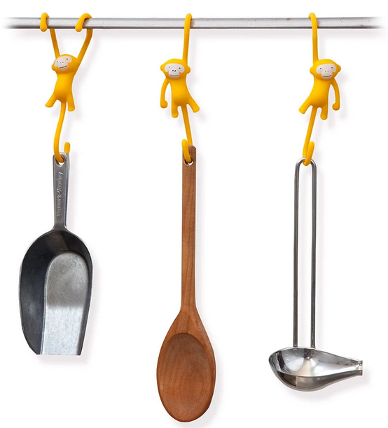 猴子们总是用长长的手臂和尾巴把自己吊在树上,设计师把这个场景还原到了挂钩上:将猴子的手臂悬挂在横架上,把尾巴作为挂钩处,往厨房里一挂,仿佛瞬间变成了小猴子的丛林~