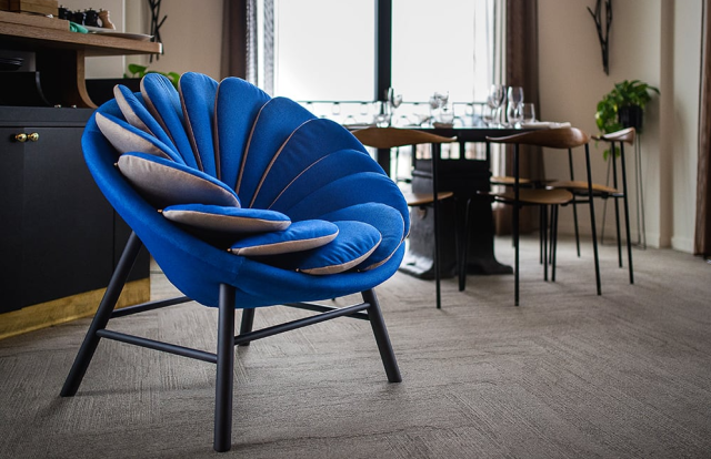第一眼看见这张椅子,没有谁不被它的美所惊艳。14片柔软舒适的双色软垫相互重叠在圆锥形的座椅框架中,像一朵明艳怒放的鲜花。