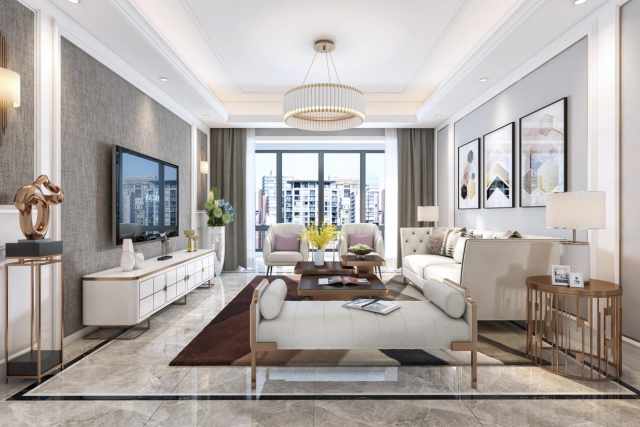 为了在视觉上最大限度呈现出空间的宽敞明朗,客厅的墙可以用全景门代替。选择全景门时,除了百搭的雅黑,还可以考虑黄铜拉丝材质,作为吸睛装饰元素的点缀,与大理石、丝绒等巧妙搭配,增添空间的奢华感。