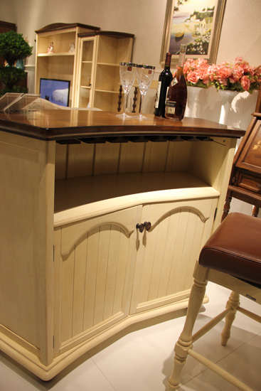 编辑点评:木质酒架大方实用,波浪形的凹槽不仅让酒瓶摆放稳固,更从视觉上美化了空间。平台部分放置独立酒架增加酒瓶收纳,储物柜内部也发挥着强大的收纳功能,三层收纳空间满足酒吧的收纳需求。