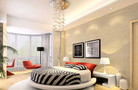 浅粉色搭配白色主调的卧室,空间还是很大的,现代简约风格,也让居室看上去非常的时尚。浪漫调调的窗帘,简单的背景墙,红色的床,为这款婚房卧室装修效果图,增添情调。