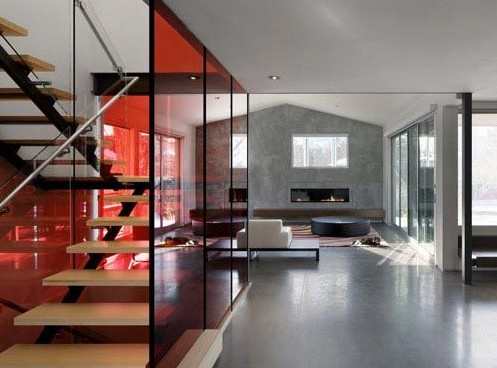 楼梯侧面由红色玻璃隔,其余都采用白色调,客厅、厨房、浴室都是如此。大面积的厨房空间,橱柜多且齐备,并嵌入烤箱。厨房采用层叠设的构造,炉灶与餐桌组合,食物制作完后直接送在距离贴近的餐桌。边欣赏美食的制作过程也是一种享受。但是小编提醒,大火煎炒的方式不太适合此间厨房。